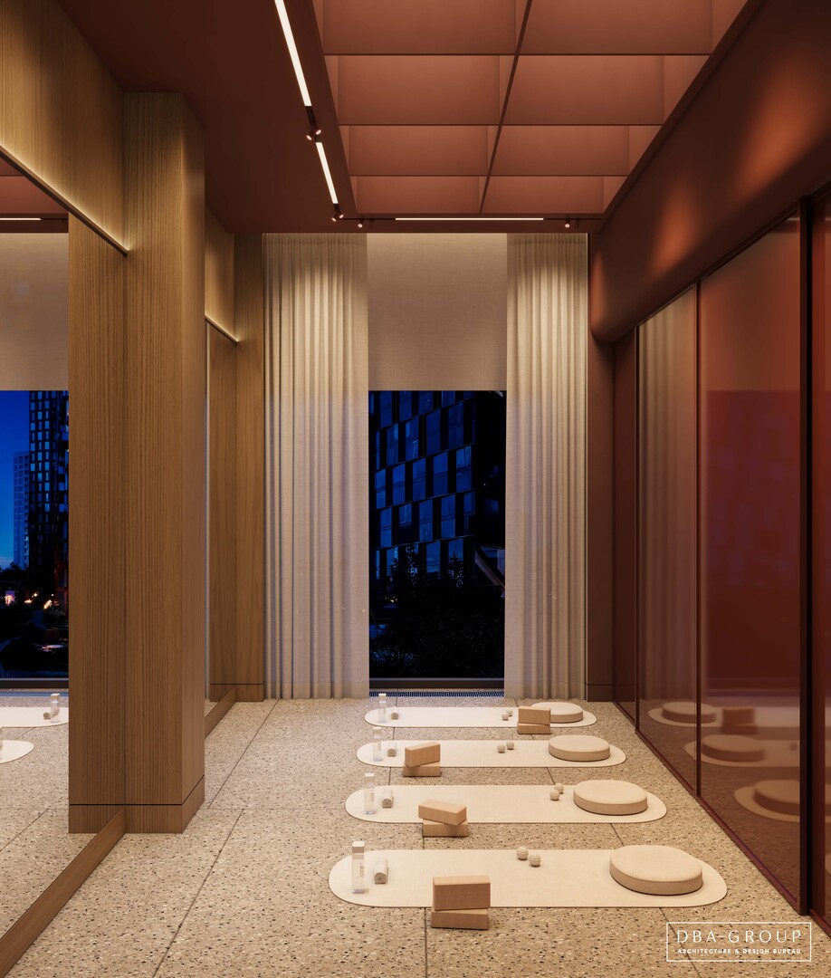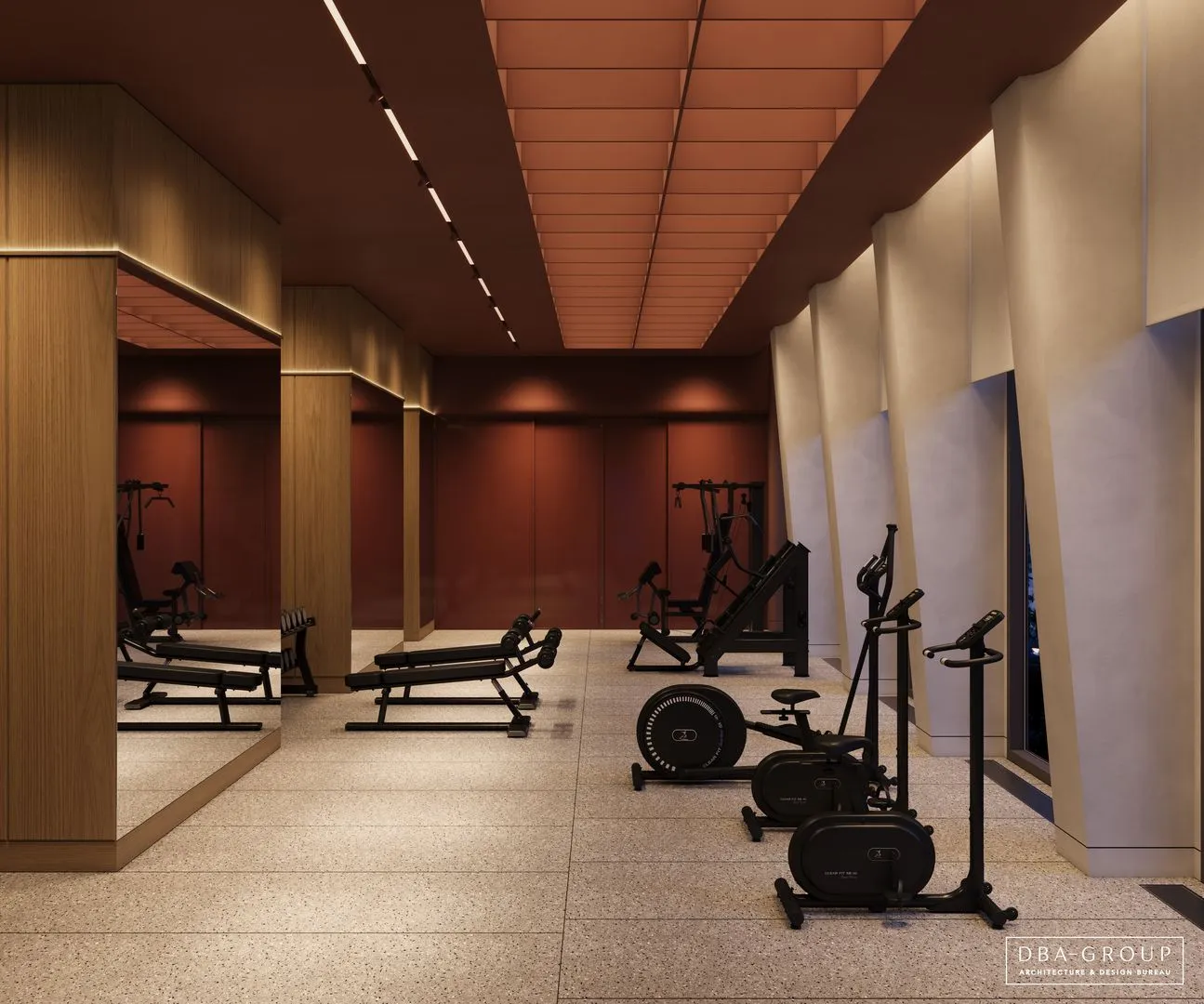 Полностью оснащенный фитнес-зал с панорамными окнами, зоной тренажеров, залом для индивидуальных занятий, раздевалками и душевыми.