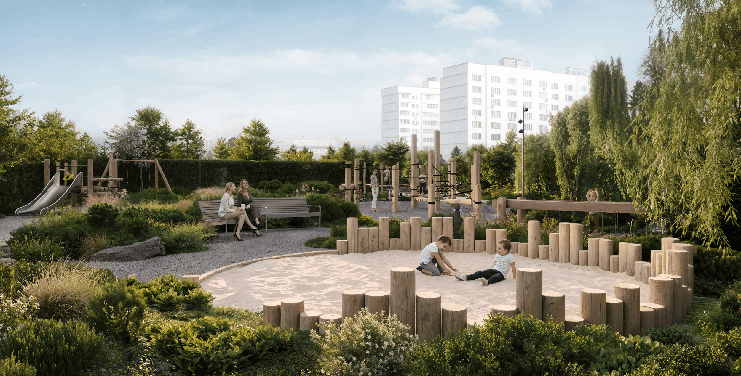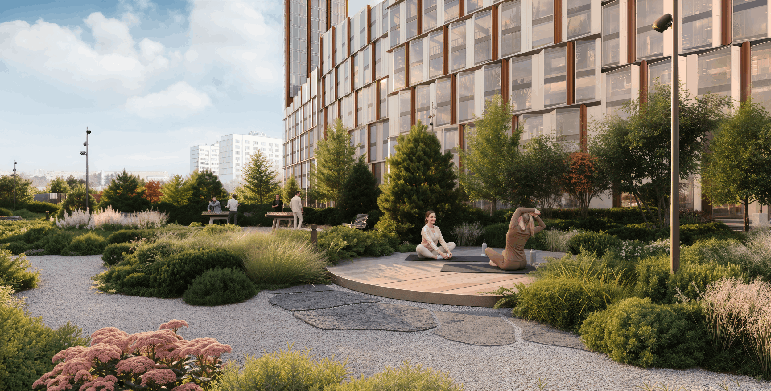 Внутренний двор задуман как приватное премиальное пространство: светлая натуральная палитра, зоны для отдыха и общения создают уютную атмосферу, сочетающую комфорт и ощущение уединенности.