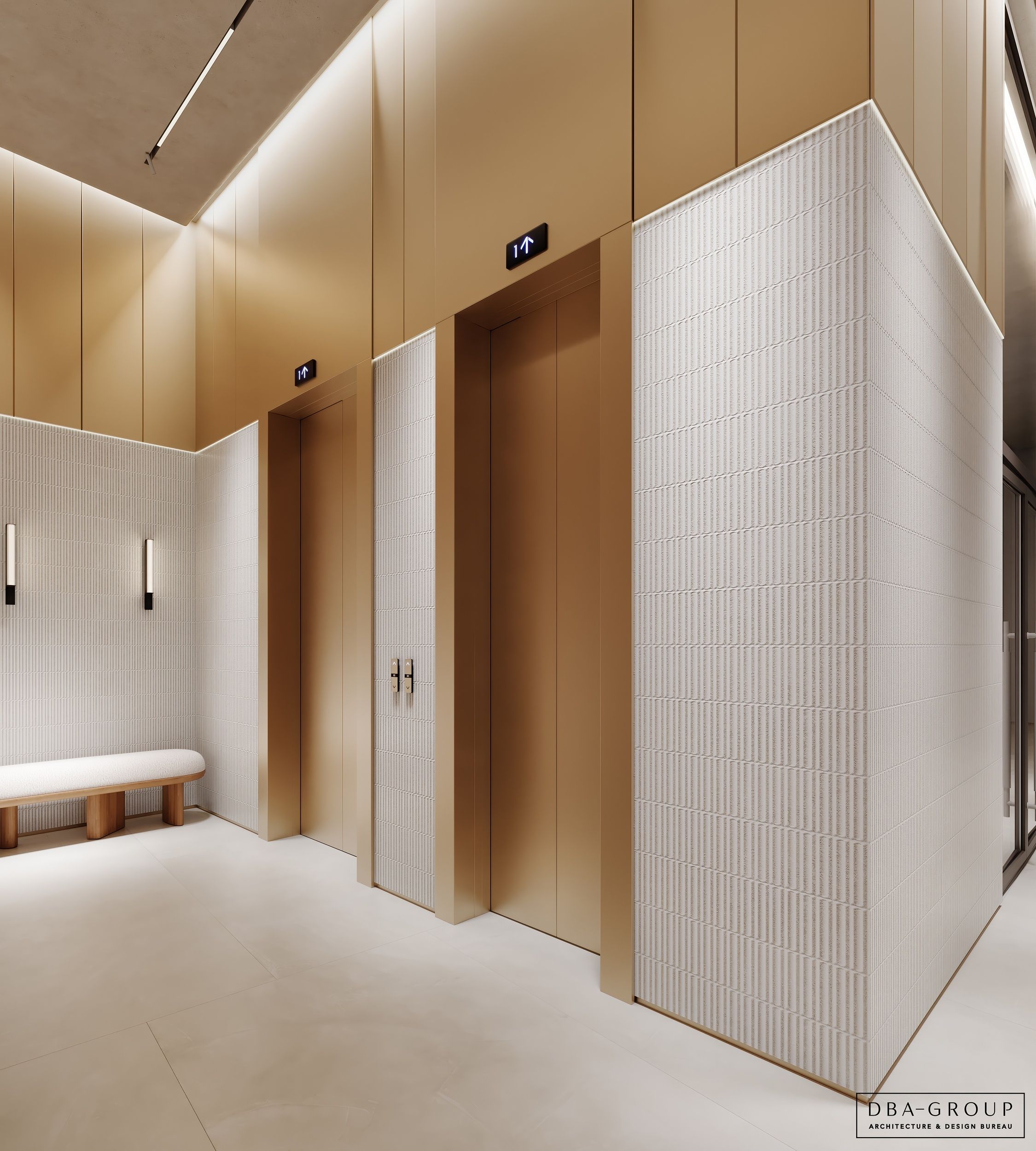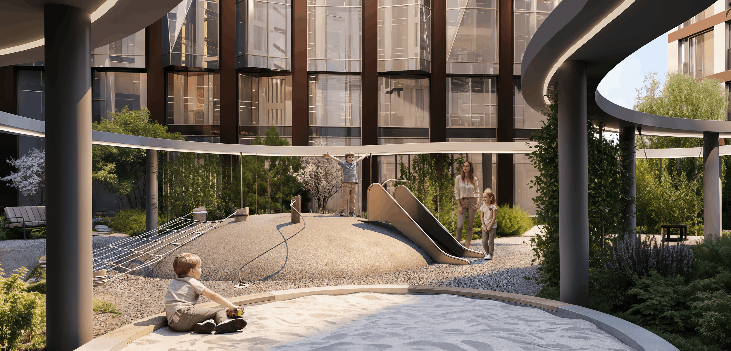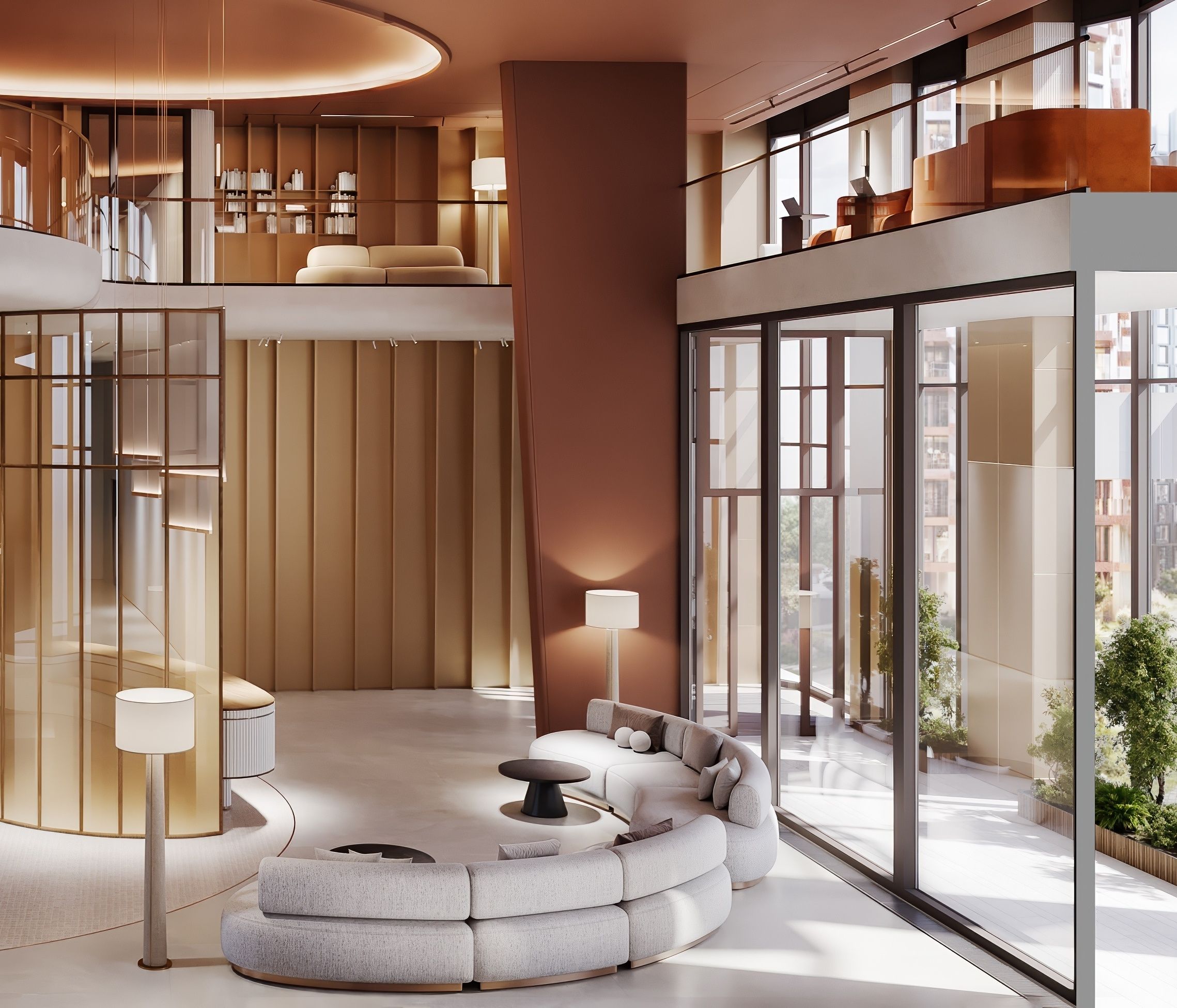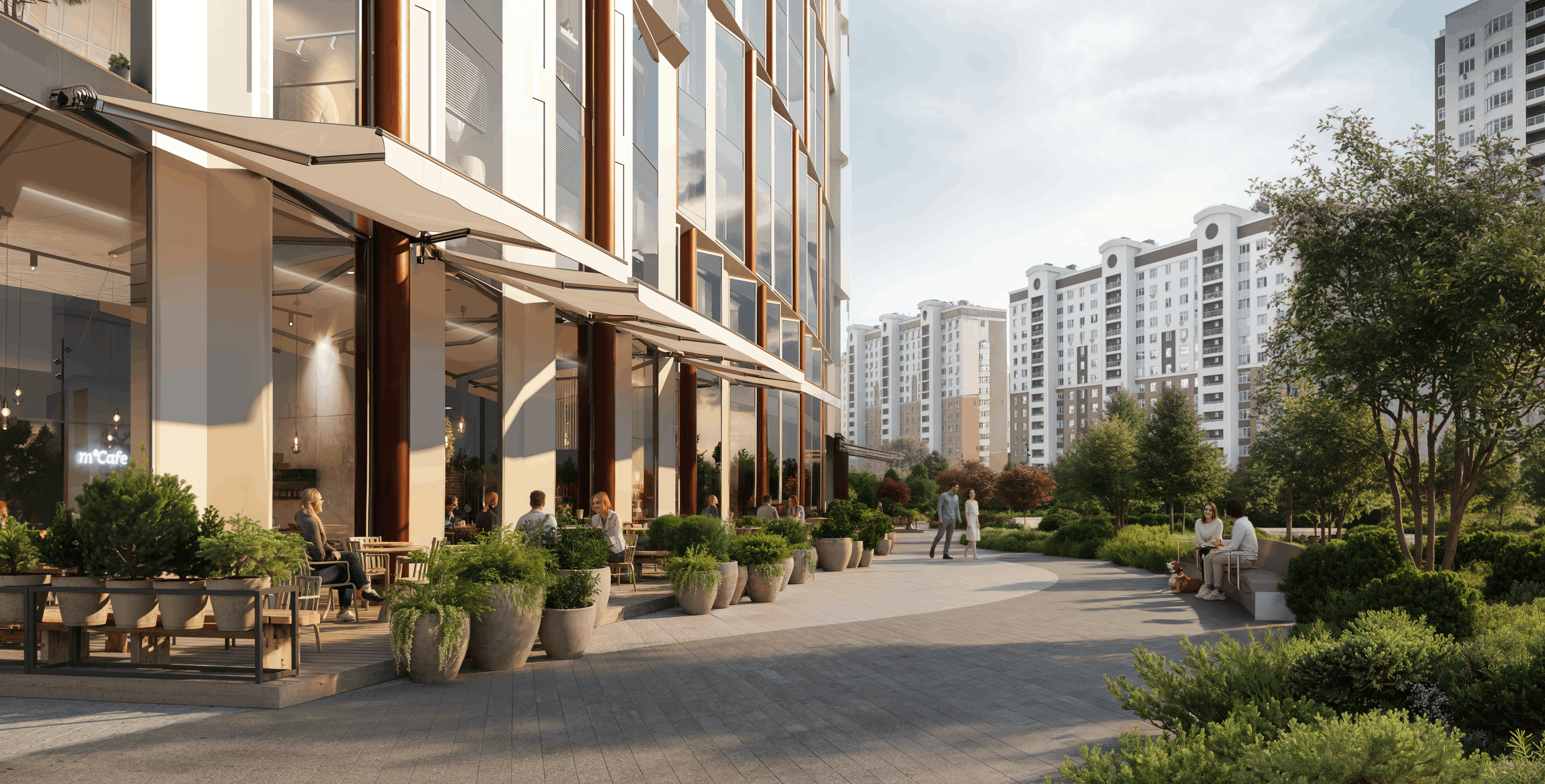 Приватные общественные пространства для резидентов и ритейл на первых этажах.