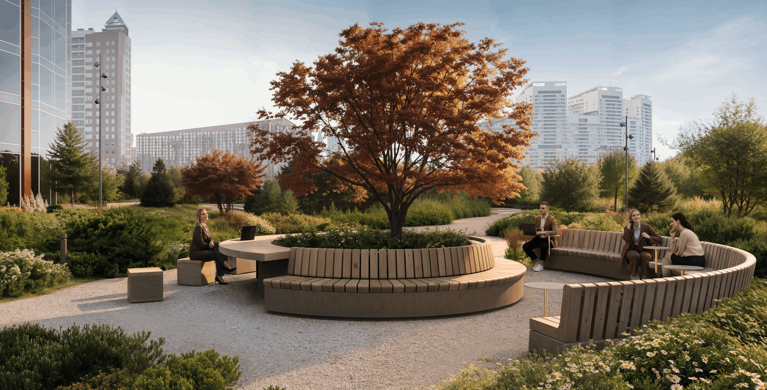 Амфитеатр, лужайка для йоги, коворкинг под открытым небом. Места для общения и обмена идеями.