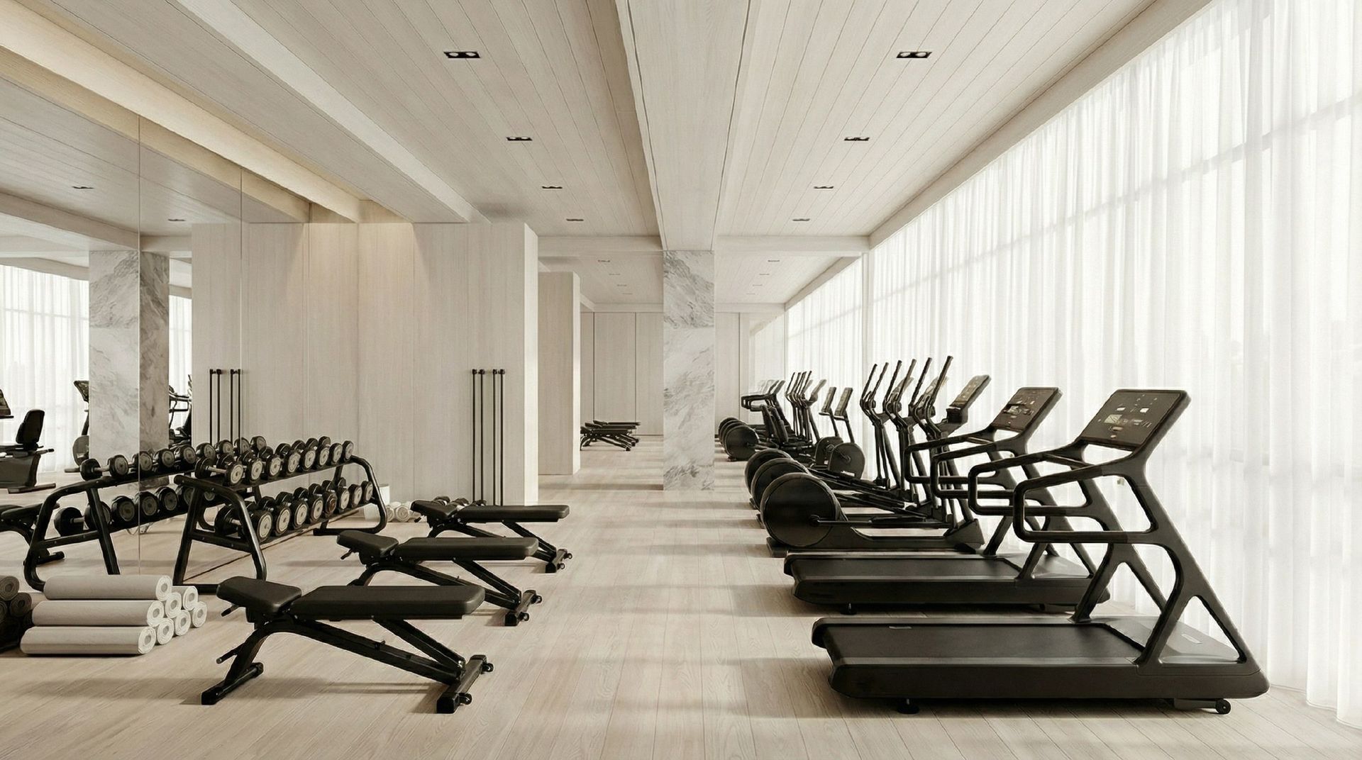 Полностью оснащенный фитнес-рум с панорамными окнами, зоной тренажеров, залом для индивидуальных занятий, раздевалками и душевыми.