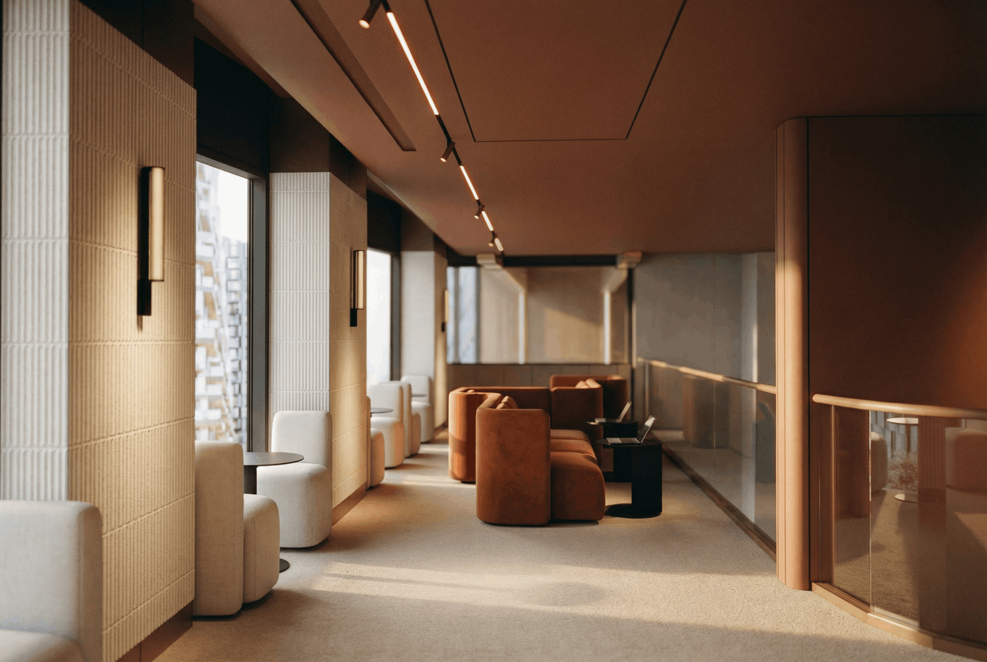 Бизнес-лаунж, в котором есть отдельное пространство с видом на линейный парк, переговорная комната, кабинет и учебное пространство, а также индивидуальные акустические кабинки для звонков.